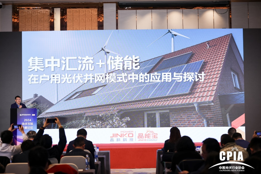 中国·888贵宾会科技户用事业部品牌副总监周新亮代表晶能宝在大会上进行了内容分享,他结合行业发展趋势和机遇,深入剖析了晶能宝的平台实力、创新应用以及成功案例,尤其是晶能宝在集中汇流和储能在户用光伏并网模式中的实际应用案例——山西省晋中市祁县峪口乡段家窑村整村汇流。